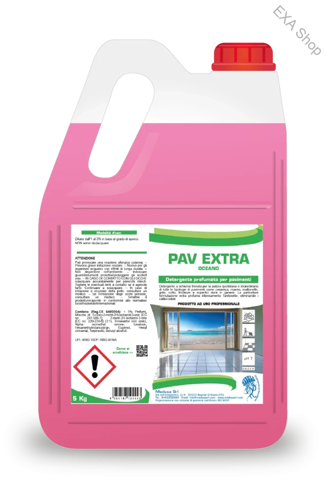 🧴 Pav Extra je vysoko účinný parfumovaný čistiaci prostriedok na každodenné umývanie všetkých druhov umývateľných podláh. Vďaka svojim aktívnym zložkám dôkladne čistí povrchy, zanecháva ich žiarivé, bez šmúh a navyše dodáva priestoru príjemnú a sviežu vôňu, ktorá sa udrží dlhšie ako pri bežných čistiacich prostriedkoch.